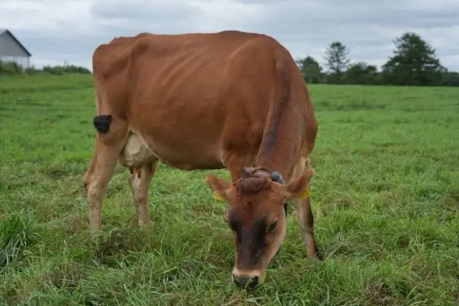 うすい茶色の毛がとってもかわいいのは、ジャージー牛。日本で飼われている乳牛の中では、ホルスタインの次に多いと言われています。ホルスタインにくらべて、出るお乳の量は少ないけれど、ジャージーのお乳はコクがあるのがポイントです。